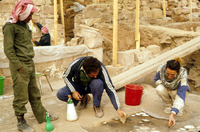 Tom, Rachel, & Hamoudi cleaning floor pieces.