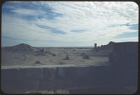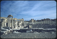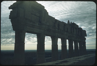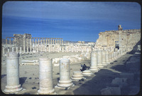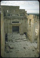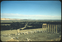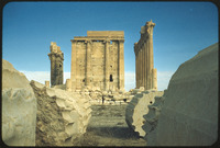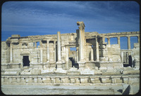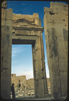 Temple of Bel: from east: NW corner of temple, colonnade, momumental arch, and Arab fortress in bkgrd colonade, momumental arch, and Arab fortress in bkgrd