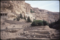 Greek Orthodox St. George monastery, Mt. Of Temptation in background; Roman aqueduct lower right side of wadi