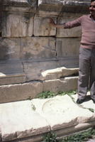 Jordan. Jerash. Nymphaeum, man pointing out a carved lion spout over carved fish basin beneath
