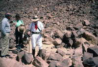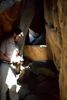 Jordan. Wadi Rum. Wadi Disi, Jabal Amud. David McCreery looking at map in rock shelter