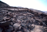 Jordan. Wadi Rum. Wadi Disi, village huts found below with many rock drawings and Thamudic inscriptions