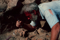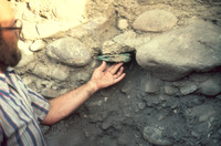 Jordan. Numeira, individual in earlier destruction level, in room of 'tower'. Mike Finnegan cleaning skull