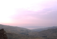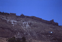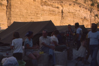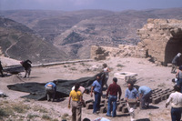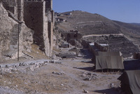 Jordan. Karak, setting up camp. Dan lifting tent.