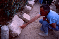 Jordan. Aqaba, Ghazi Bisheh pointing at Quranic inscription from gate