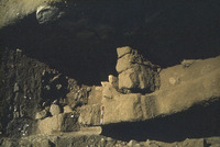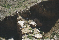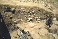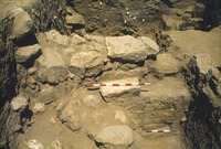Jordan. Tell er-Rumeith, looking west at square 1, large stone substructure against mudbrick wall