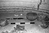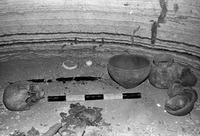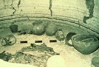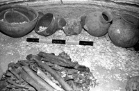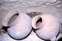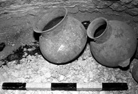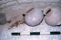Jordan. Bab edh-Dhra', Cemetery A, Tomb A76E. Closeup of pots in front of basket fragments