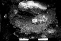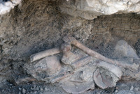 Jordan. Bab edh-Dhra' cemetery, roadside trench tomb. Closeup of bones and pots