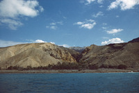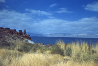 Jordan. Ain ez-Zara, looking east at Callirrhoe (ancient harbor site) from departing boat