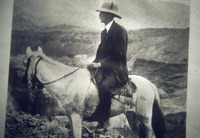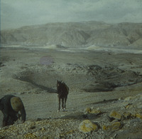 Jordan. Reverend Kyle G. Kelso on horse in front of mountains in Ghawr es Safi