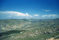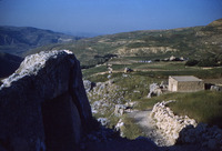 Jordan. Iraq al-Amir, from southeast corner of village. Roman cemetery central foreground, camp behind, Qasr to right, Wadi as-Seer to left