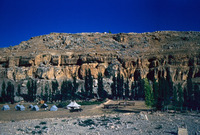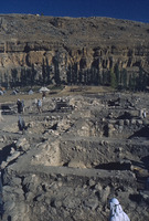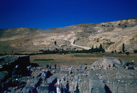 Jordan. Iraq al-Amir, looking north at excavation in village. Camp and caves behind