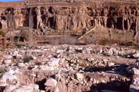 Jordan. Iraq al-Amir, looking at first "Tobiah" cave from camp. Inscription visible in center
