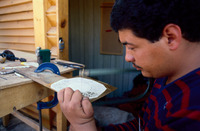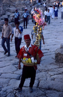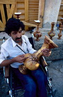 Jordan. Jerash, Festival, handicapped craftsman with wooden vase