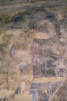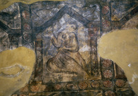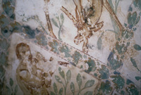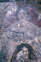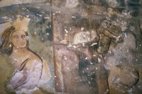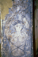 Jordan. Qusayr Amra, detail of a female figure holding a child on the S. tympanum of the women's "caldarium"