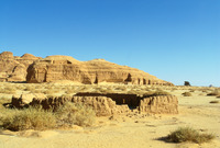 Saudi Arabia. Mada'in Saleh, Qasr al-Bint and remains of old house in forground