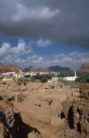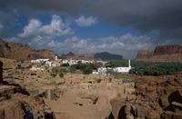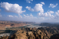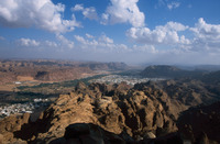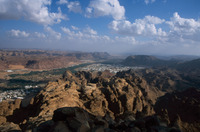 Saudi Arabia. Al-Ula, view south over town, wadi and mountains from Jabal Harra