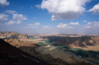 Saudi Arabia. Al-Ula, view north over wadi and mountains from Jabal Harra