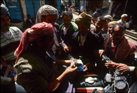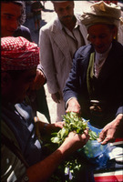 Yemen. Sana'a, Qat purchase on motorbike in souq