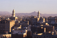 Yemen. Sana'a, minarets of Great Mosque & old houses