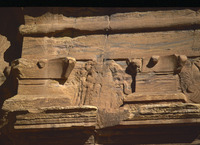 Petra, Mughar an-Nasara , detail of carving of Medusa head on Triclinium façade