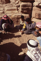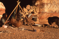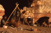 Petra, Bdoul bedouin woman making butter in goat skin; Mughar an-Nasara