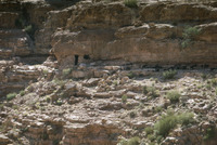 Jordan. Petra, site H-2. Dakhilallah Qublan's house in cliffs of Wadi Marwan, with goats