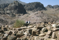 Jordan. Petra, Inweijeh pointing to sites for Kenneth Russell, looking into Wadi Siyagha from ad-Dair