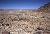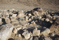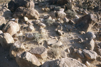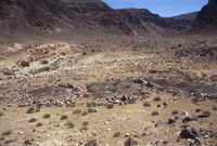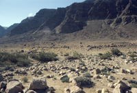 Jordan. Petra, corral outlines and staining at "waterfall site", Wadi Judaiyid. Boulders in foreground covered with petroglyphs