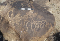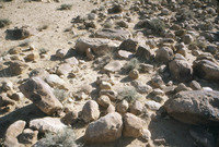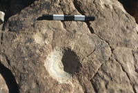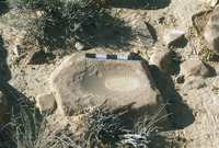 Jordan. Petra, quern in stone circle at Dave Jacobsen's "waterfall site", note 25 cm scale stick on rock, upper center above quern, Wadi Judaiyid