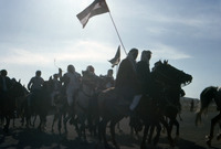 Jordan. Men on horses carrying flag of Jordan