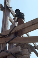 Jordan. Pella (Tabaqat Fahl), workman on wooden scaffolding surrounding column and capital