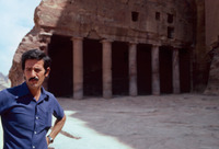 Jordan. Pella (Tabaqat Fahl), Brian Bowen and David McCreery and workmen with wooden scaffolding surrounding column and capital