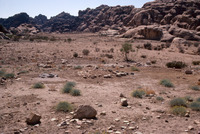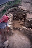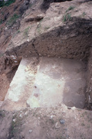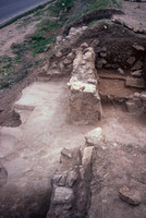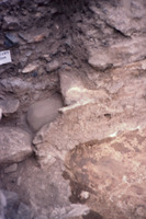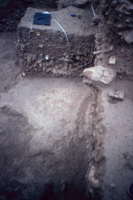 Jordan. Ain Ghazal, apsidal house with fire pit in left foreground and burial pit, seen from north
