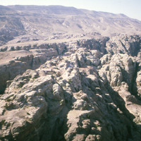 Jordan. Petra, high place, oblisks, from the north, aerial