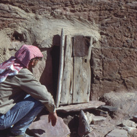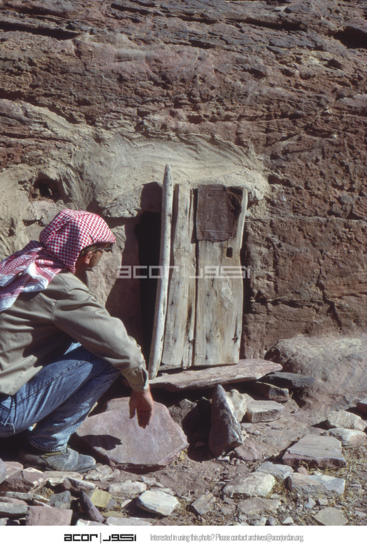 Jordan. Petra, mahsan (storage structure) Salalmi A'id, plotted only, door with metal insignia, at head at Wadi al-Wagit