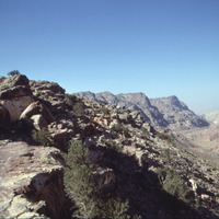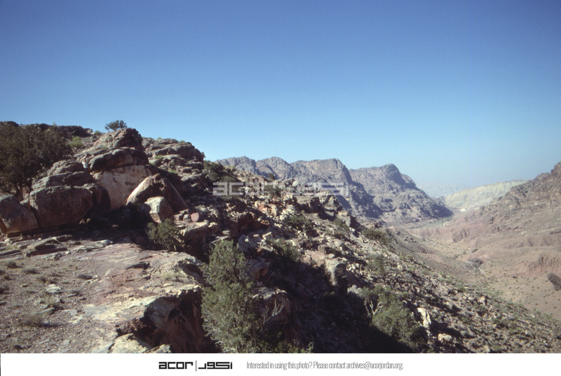 Jordan. Petra, remote storage site 88-23, Wadi Sabra in distance, east side, Wadi Batabi, Wadi Batahi