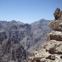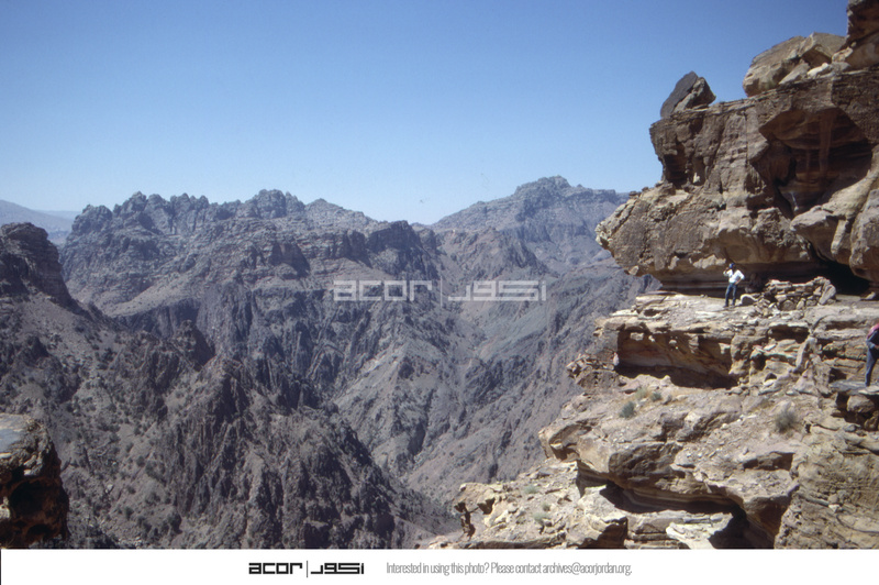 Jordan. Petra, Tor Sharafat at-tweil site 88-27, environmental overview looking southwest, cave on right