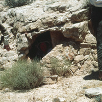 Jordan. Petra, remote storage site 88-6, Steve Simms in doorway