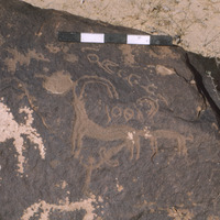 Jordan. Petra, hunting scene at waterfall site. Dog nipping at horned animal? Wadi Judaiyid