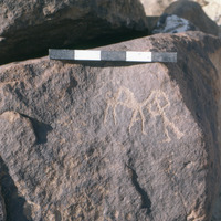 Jordan. Petra, camel petroglyph with person, Wadi Judaiyid