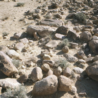 Jordan. Petra, quern in stone circle at Dave Jacobsen's "waterfall site", note 25 cm scale stick on rock, upper center above quern, Wadi Judaiyid