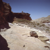 Jordan. Petra, site H-14. Note debris slope, bedrock mortar in foreground