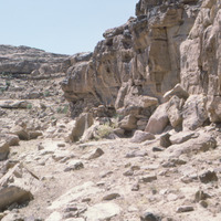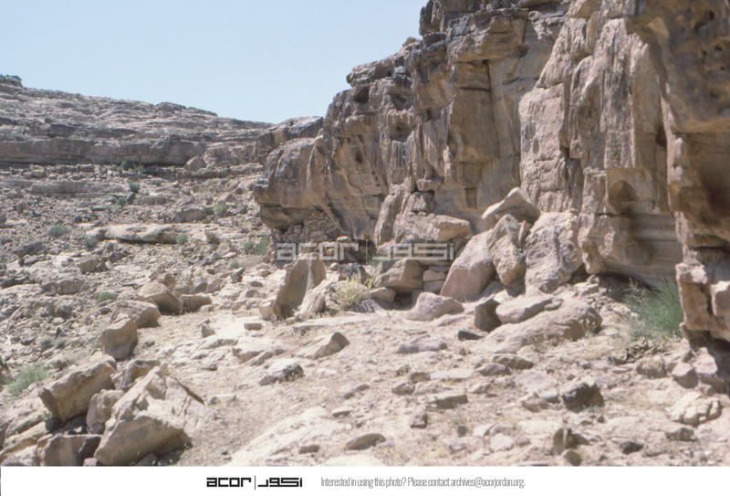 Jordan. Petra, looking back to {sa} at site H-11, Jebel Farasah site H-10 in rimrock to left