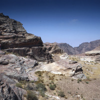 Jordan. Petra, storage structure S-3, distance shot looking down west down Wadi Marwan