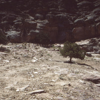 Jordan. Petra, site H-3, overview of entire site. Alcove to rear, juniper with leben platform to left, south slope, Wadi Marwan