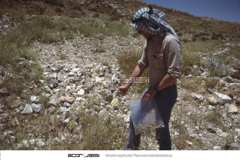 Jordan. Petra, Steve Simms experimentally collecting wild grasses on plateau above Petra, just north of turnoff to el-Hai