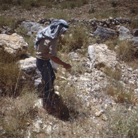 Jordan. Petra, Steve Simms harvesting wild grasses on plateau above Petra, just north of turnoff to al-Hai