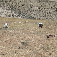 Jordan. Petra, family of Sahlim Im-Mohammed hand-harvesting barley south of Petra. Tripod used to sling baby from as "babysitter"