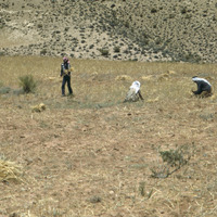 Jordan. Petra, family of Sahlim Im-Mohammed hand-harvesting barley south of Petra. Sa'ed Qublan's in tan at center